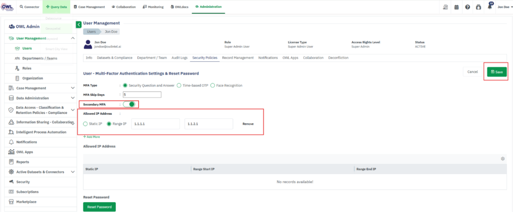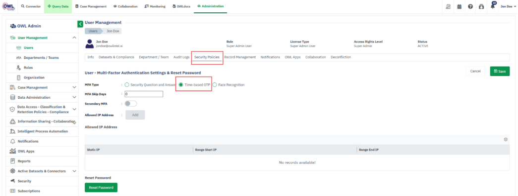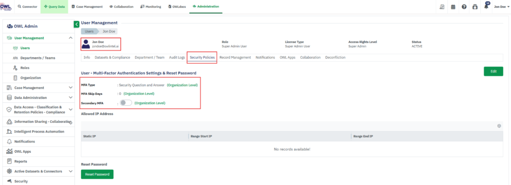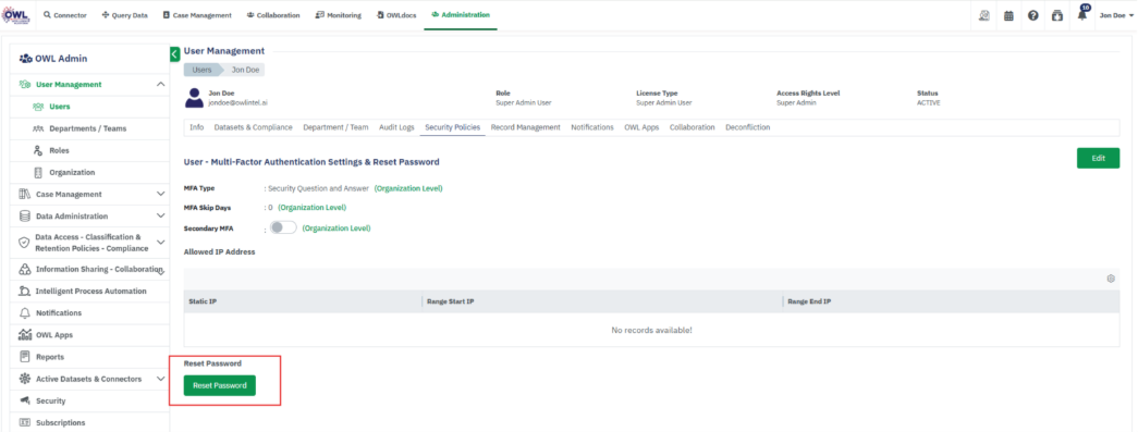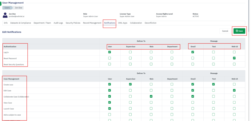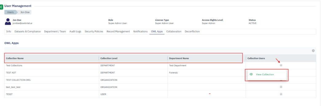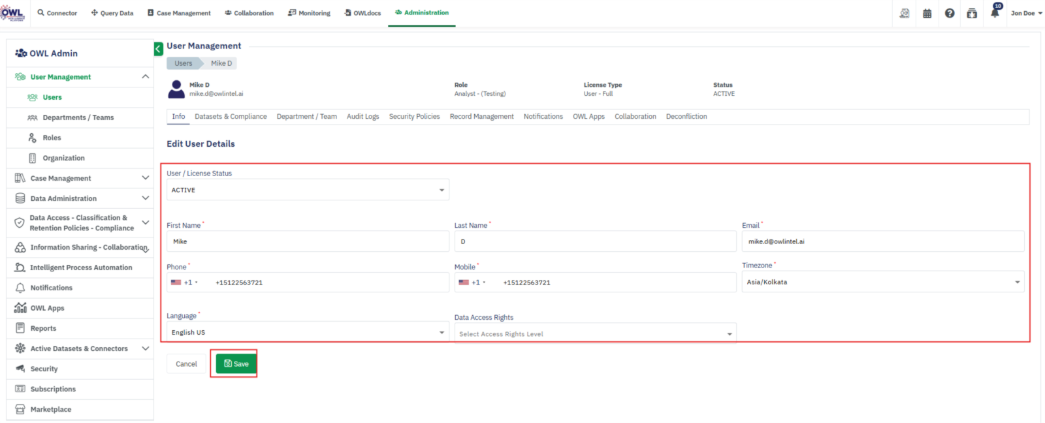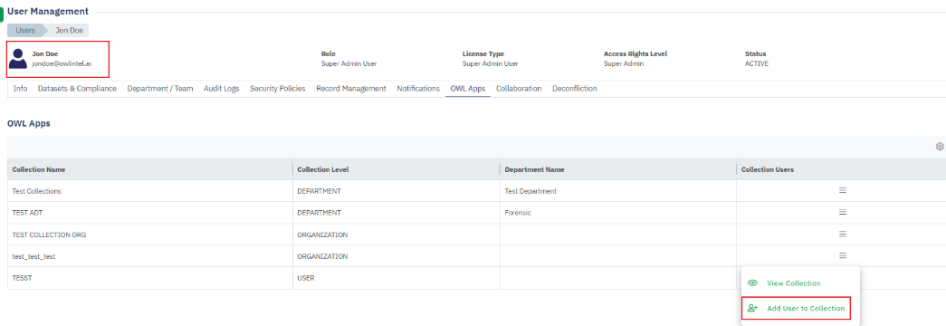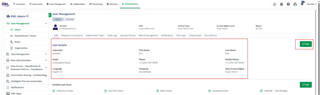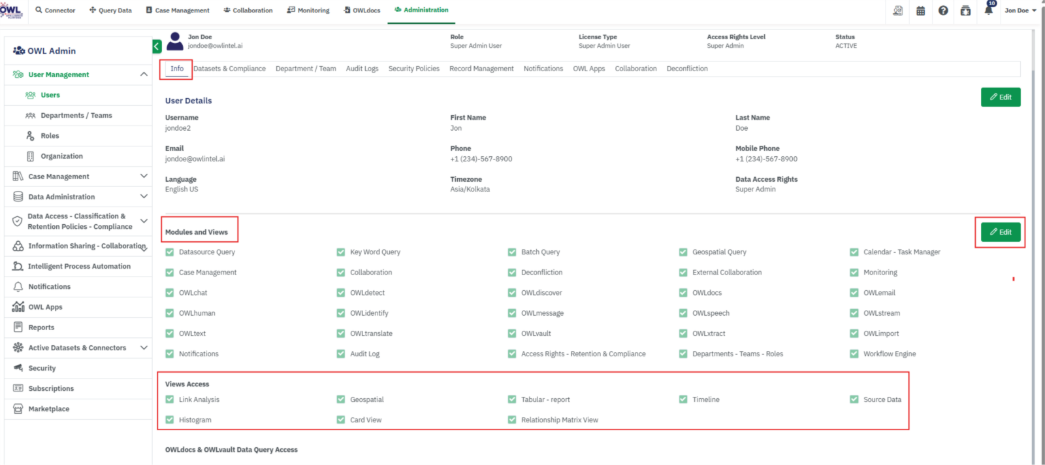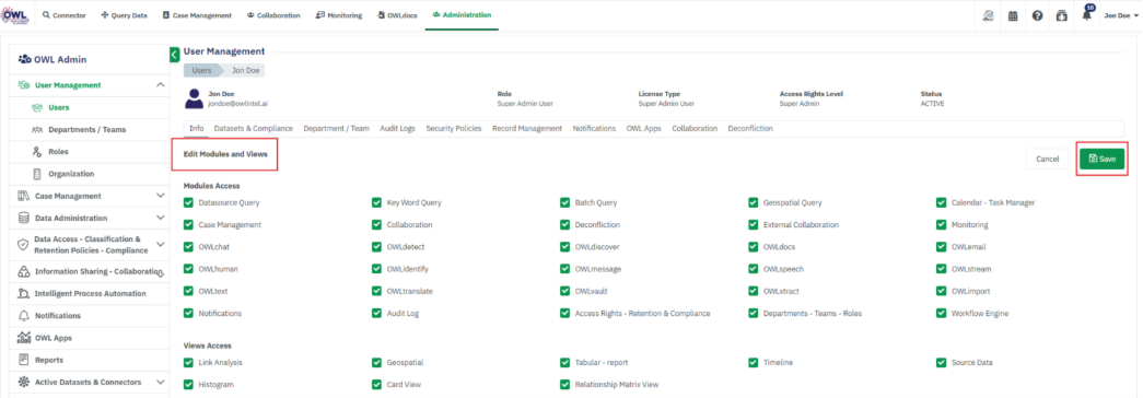 • View User details (Departments, Compliance, Audit Logs, Own Records, Notifications, OWL Apps)