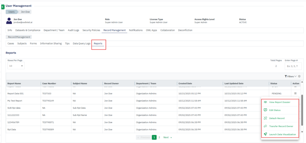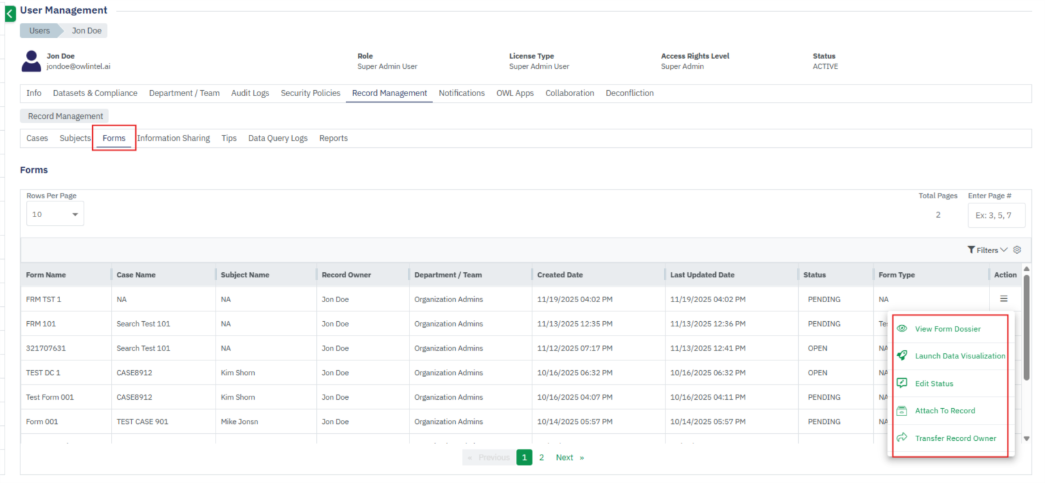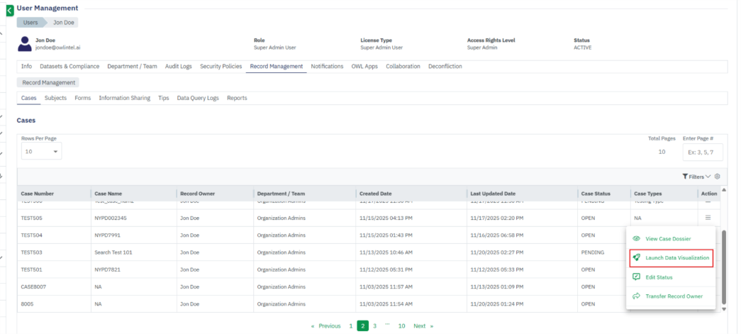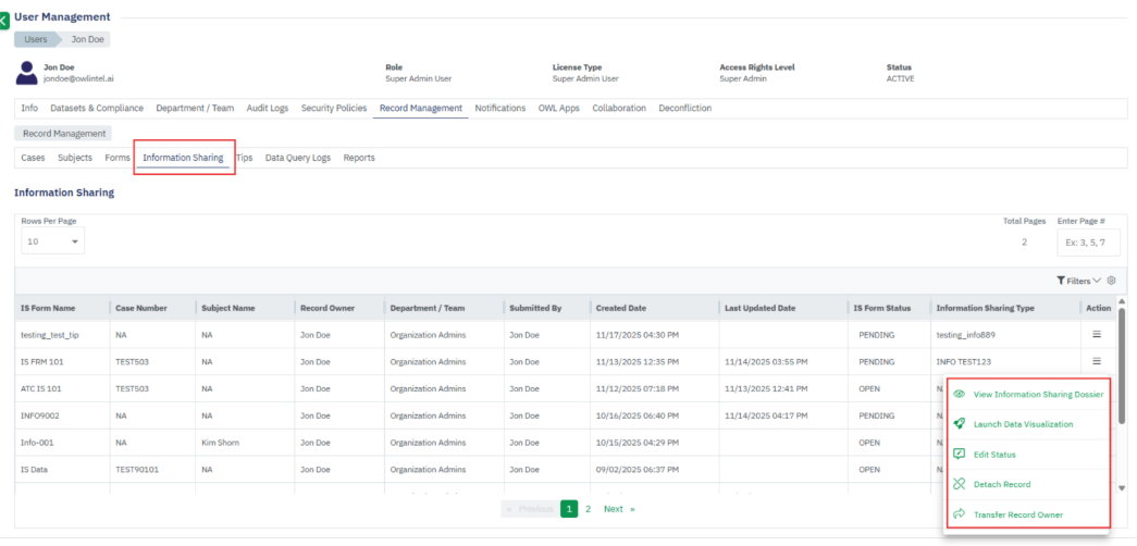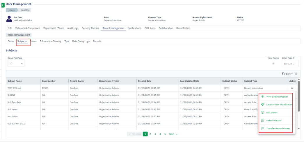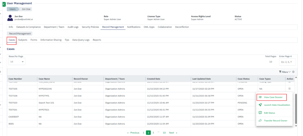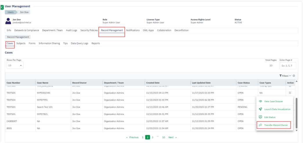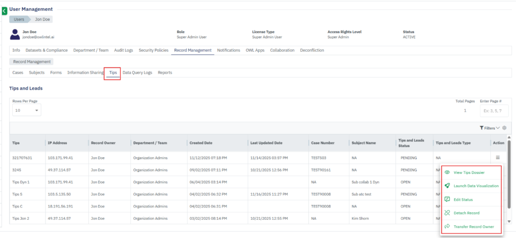 - The Record Management section within User Management stores all user-generated records, including Cases, Subjects, Forms, Information Sharing, Tips, Reports, and OWLdocs.