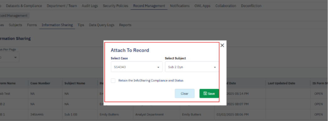 - If Information Sharing is not linked to any Case or Subject, then it can be attached to a case/subject from the Action menu, the Attach Record option.