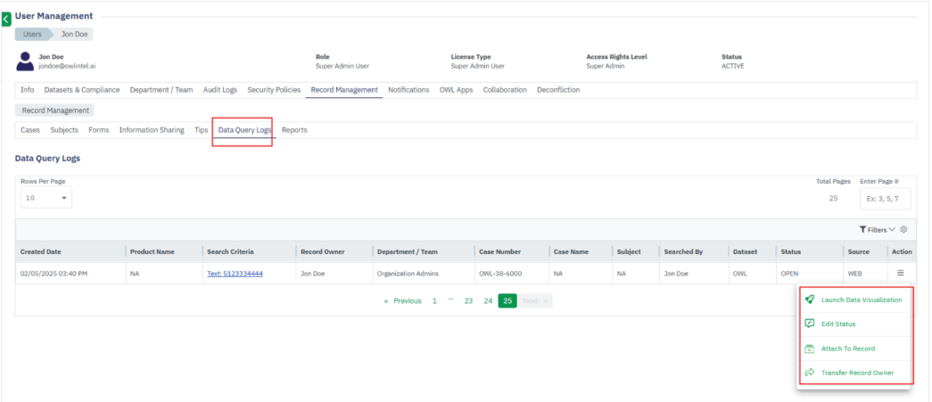 - On the Data Query Logs tab, all the data query searches associated with the user will be displayed.
