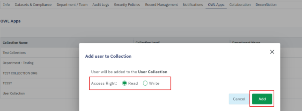 - Click on Add to add the user to the selected collection.