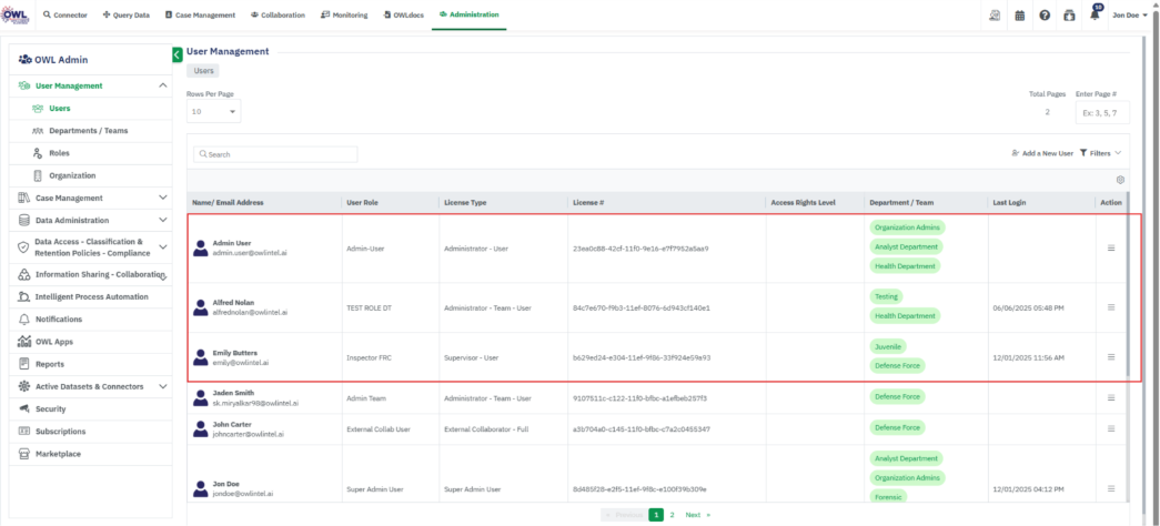 All users created within OWL are accessible via the User Management > Users page. By default, this page displays all active users. You can use the available filters to view users who are disabled or closed. Each user entry includes key details such as User Role, Associated Departments, License Type, and Last Login Timestamp.