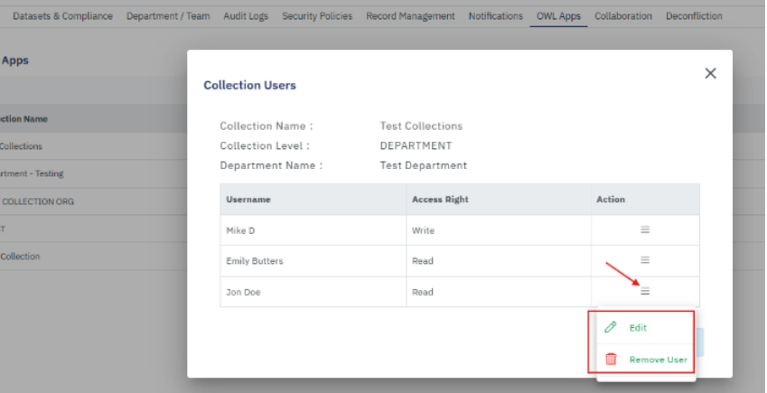 - Edit the collection users from the action menu preset in the Collection user pop-up.