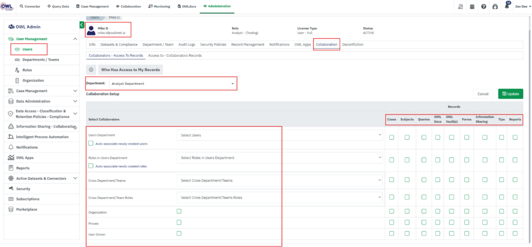 - All Supervisors and Admin Team users have access to add/update the collaboration setup for all roles and users who belong to their departments only.