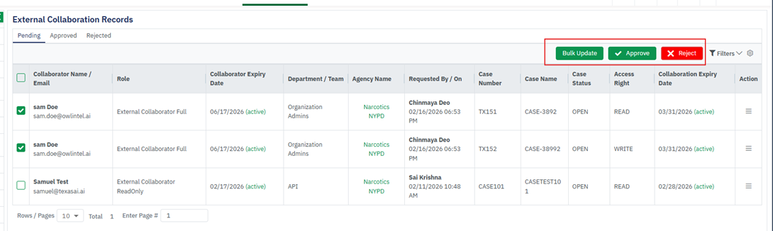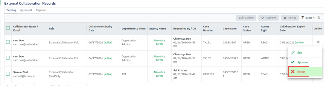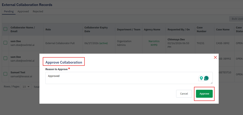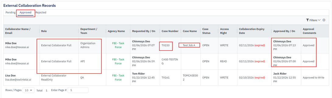 Once a pending external collaboration request is Approved or Rejected, it automatically moves to the appropriate tab under External Collaboration Records.