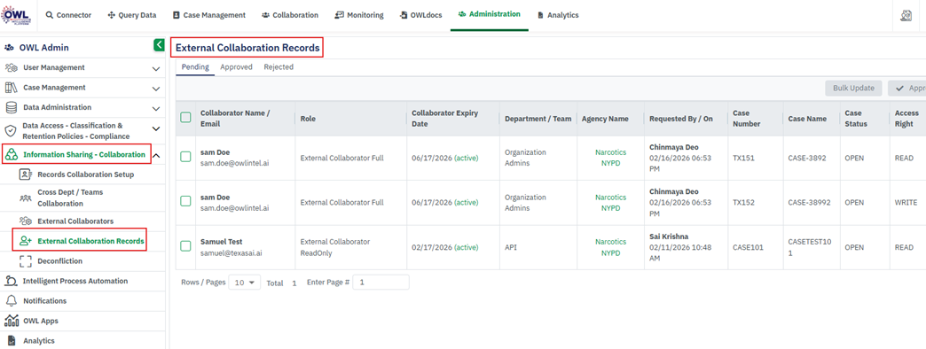 Information Sharing → Collaboration. - Click External Collaboration Records to view all pending requests.
