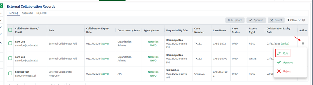 If needed, you can edit the access rights or expiration date using the Edit option under the Action menu. - Also, you can select multiple requests at a time to do a bulk update/approve/reject.