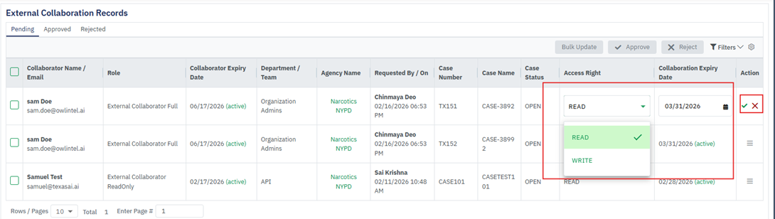 Collaborator details, agency, department, case number, expiration date, access rights, and case status. - Review the details carefully.